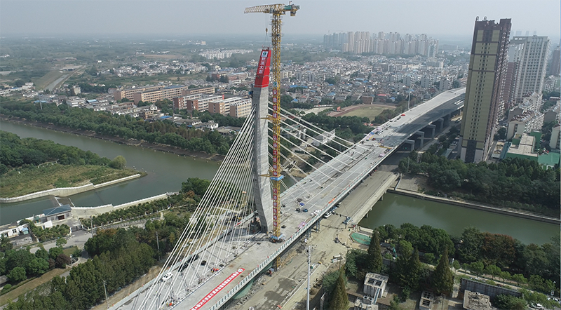 獨(dú)塔斜拉橋?yàn)楸卷?xiàng)目控制性工程,主塔采用“主體立面為月形,下塔柱為圓形鏤空”的混凝土塔,塔身高度近百米,塔西邊次跨84米+塔東邊主跨152米,主跨152米在老橋上面跨越店埠河,施工難度較大。自2021年8月22日主塔建設(shè)以來,項(xiàng)目管理人員克服施工技術(shù)難點(diǎn),嚴(yán)把關(guān)鍵工序,應(yīng)用變曲線鋼筋分段預(yù)制、鋼木組合模板、制作索導(dǎo)管精平定位裝置等多項(xiàng)新技術(shù),平穩(wěn)快速推進(jìn)施工進(jìn)度。在項(xiàng)目部全體人員的共同努力下,完成主塔封頂,并實(shí)現(xiàn)國慶當(dāng)天道路地面系統(tǒng)通車放行。預(yù)計(jì)年底完成全線建成通車任務(wù),建設(shè)工期合理縮短了9個(gè)月。